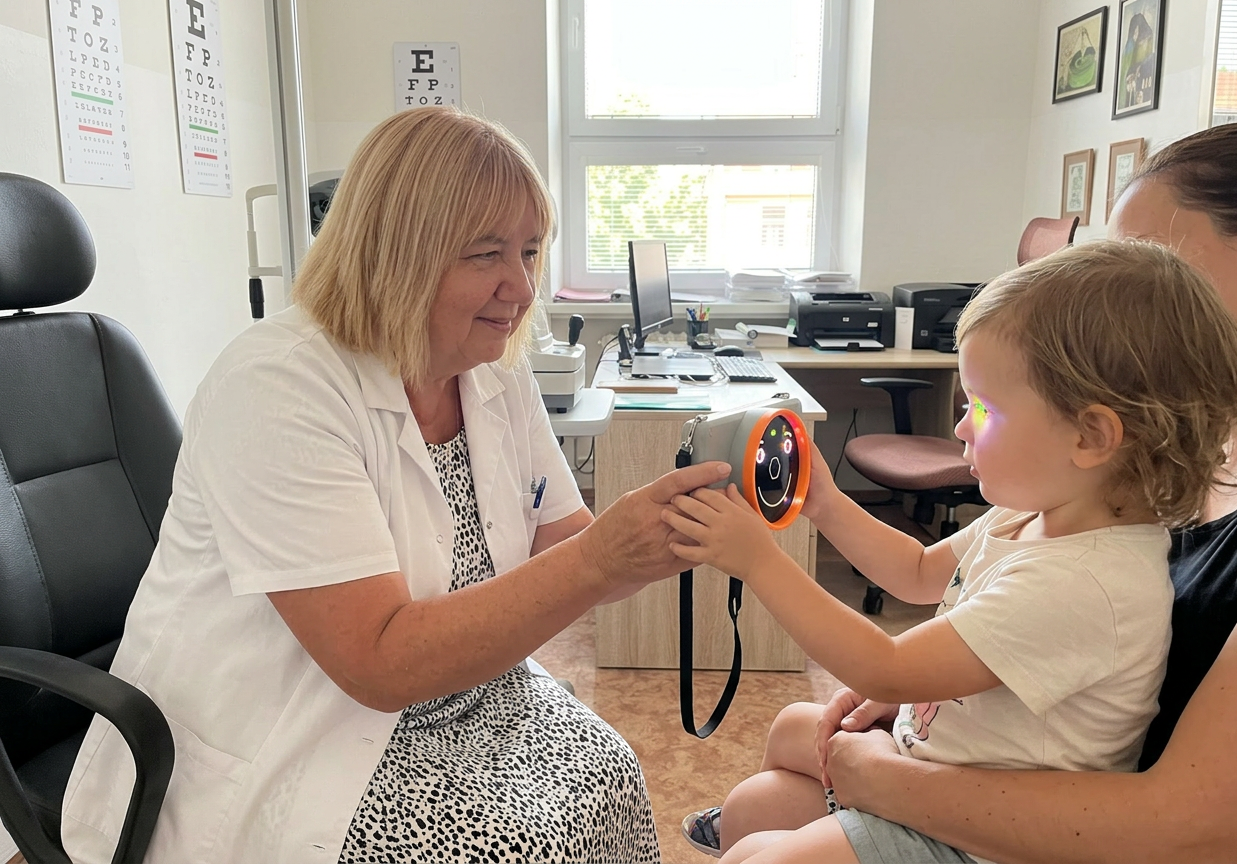 Moderní screeningový přístroj Plusoptix dokáže během několika sekund odhalit možné oční vady. Vyšetření je rychlé, bezbolestné a vhodné i pro velmi malé děti.